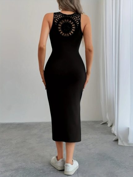 Kadın Askılı Yuvarlak Yakalı Yandan Yırtmaçlı Arkası Dantel Detaylı Viskon Elbise