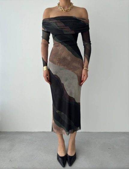 Leopar Sırt Detaylı Leopar Desenli Saten Elbise