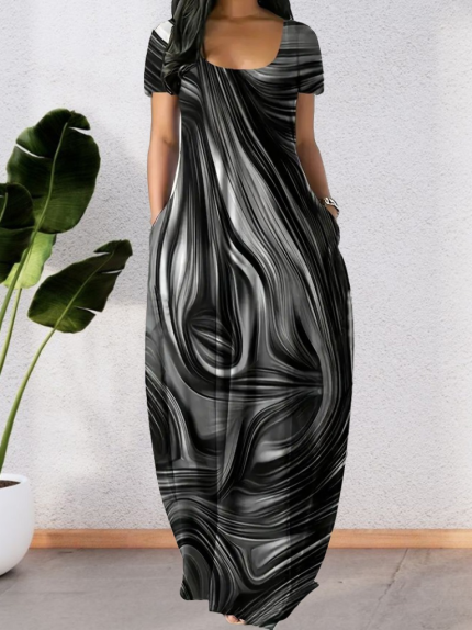 Kadın Kısa Kollu Yuvarlak Yaka Cepli Salaş Baskılı Süprem Elbise