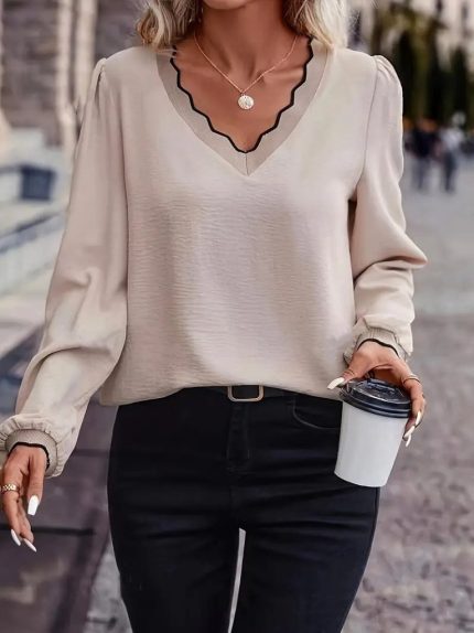 Kadın Uzun Kollu Geometrik Yakalı Gipe Detaylı Krep Bluz