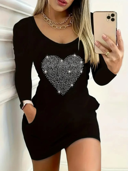 Kadın Uzun Kollu Yuvarlak Yaka Taşlı Kalp Desenli Viskon Iki Iplik Elbise