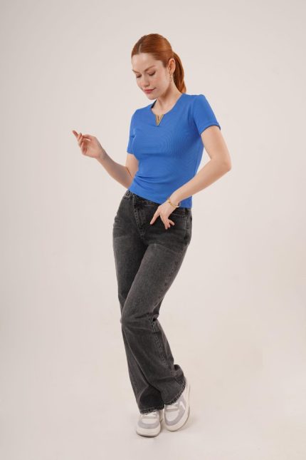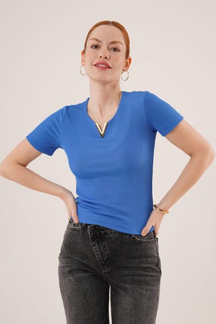 Kısa Kollu Yaka Detaylı Kaşkorse Saks Bluz