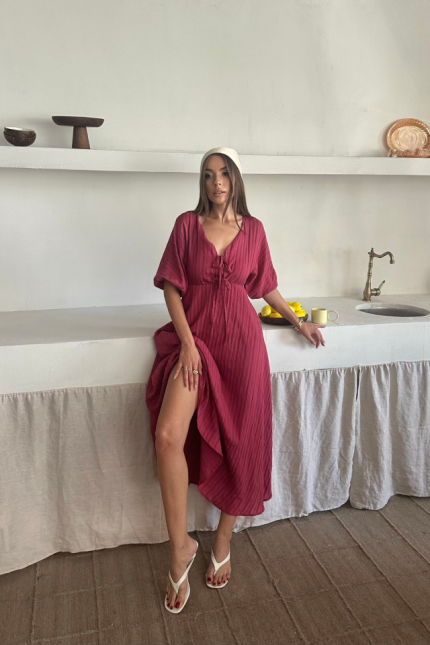 V YAKA DÖKÜMLÜ ELBİSE – Pembe