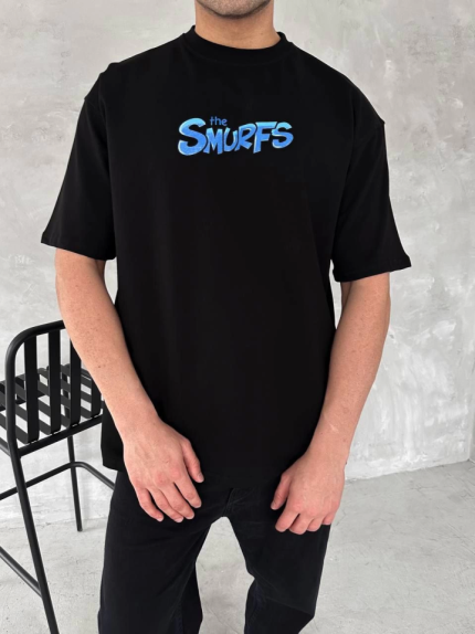 Ön Ve Arka Baskılı Oversize Bisiklet Yaka T-shirt- Siyah