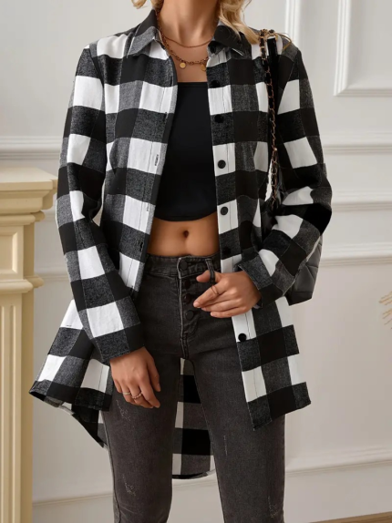 Kadın Uzun Kollu Ekoseli önden Düğmeli Dokuma Uzun Gömlek