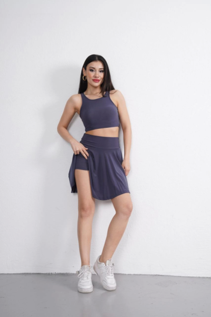 Sendy Kumaş Bisiklet Yaka Crop Şortlu Etek Ikili Takım – Antrasit
