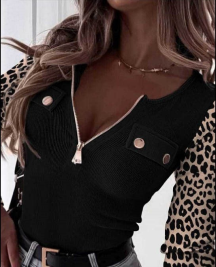Kadın Uzun Kollu Leopar Desenli Fermuarlı önden Cep Ve Düğme Detaylı Kaşkorse Bluz