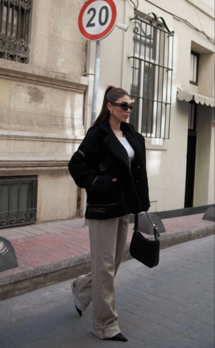 Cıt Cıt Detaylı Peluş Mont Ceket – Siyah