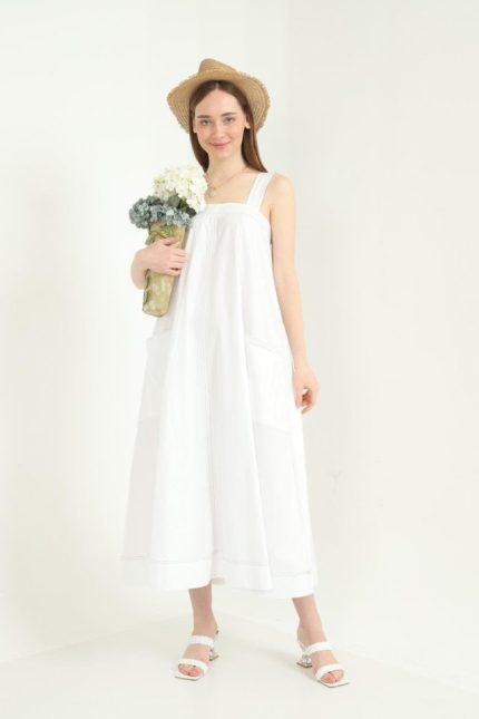 Kadın V Yaka Sırt Dekolte Detaylı Askılı Midi Boy Elbise