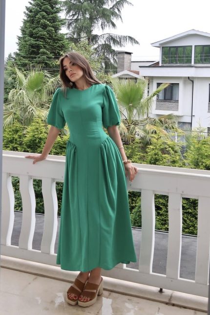 Yeşil Arkadan Bağlamalı Büzgülü Keten Elbise