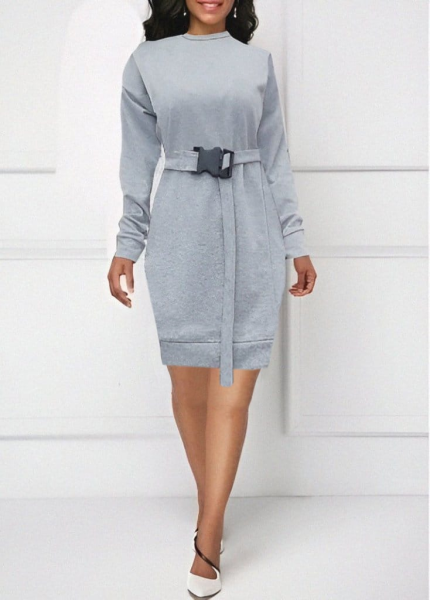 Kadın Uzun Kollu Bisiklet Yaka Kuşaklı Iki Iplik Elbise