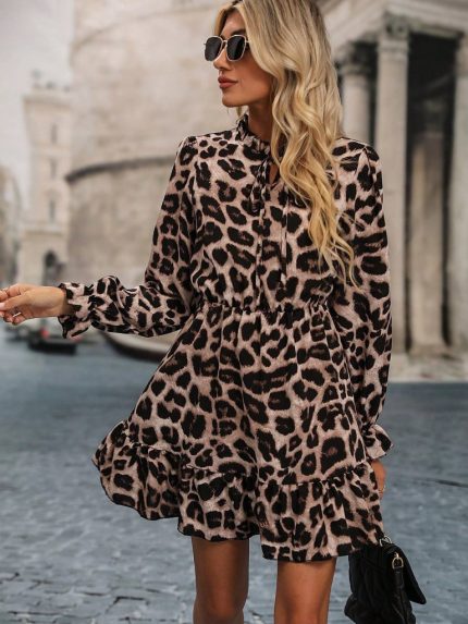 Kadın Uzun Kollu Yakadan Bağcıklı Modal Leopar Desenli Mini Elbise