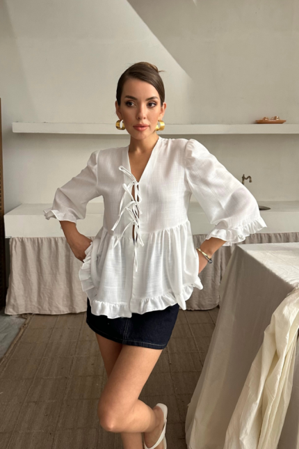 KETEN BLUZ ÖNDEN BAĞLAMALI FIRFIR DETAYLI – Beyaz