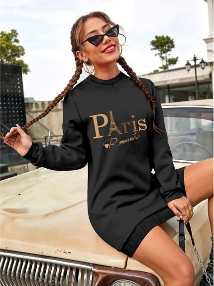 ₺700,00Kadın Uzun Kollu Bisiklet Yaka Yazılı Kısa Viskon Iki Iplik Elbise