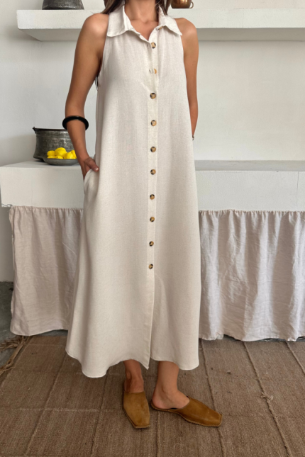 KETEN ÖNDEN DÜĞMELİ KOLSUZ GÖMLEK YAKA ELBİSE – Beyaz