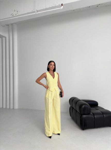 Ekru Beli Kuşaklı Ceket Ve Pantolon Parlak Takım