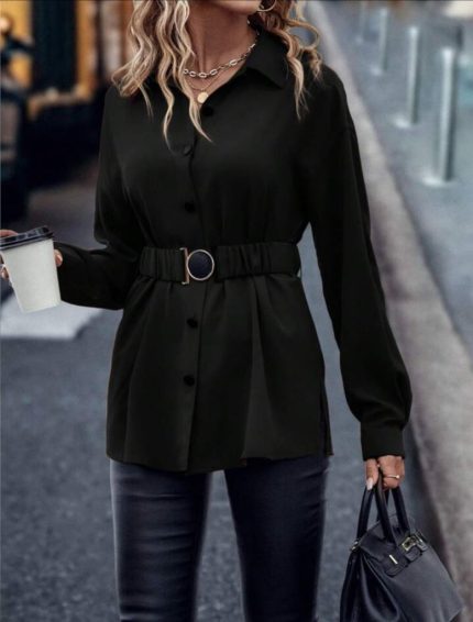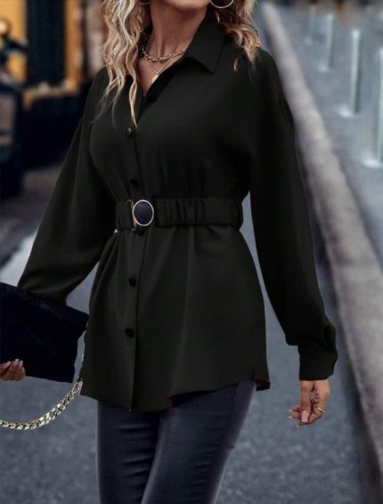 Kadın Uzun Kollu Bisiklet Yaka Omuzdan Uzun şerit Sırtta Bağlanan Kuşak Detay Viskon Bluz