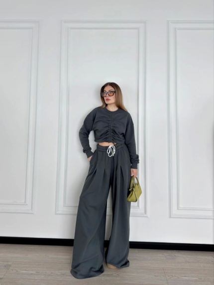 Uzun Kollu Önü İp Büzgülü Crop Ve Pantolon İkili Takım – Antrasit
