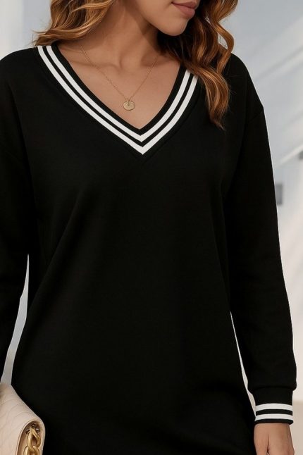 Kadın Uzun Kollu V Yakalı şerit Detaylı Kısa Viskon Iki Iplik Elbise