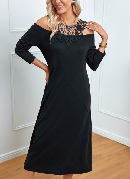 Kadın Uzun Kollu Yaka önü Güpürlü Madonna Yaka Viskon Midi Boy Elbise