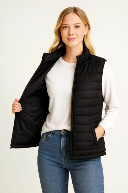 Şişme Fermuarlı Yelek Su Itici Kapitone Astarlı Kumaş Cepli Hafif Kışlık Spor Rahat Kalıp – Siyah