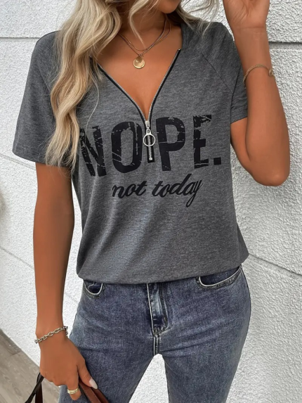 Kadın Kısa Kollu önden Fermuarlı Yazı Baskılı Viskon Bluz
