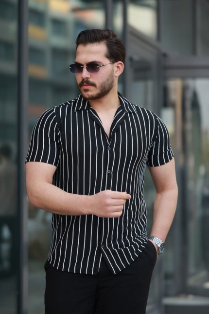 Erkek Kısa Kollu Beyaz çizgi Desenli örme Kumaş Pamuklu Gömlek
