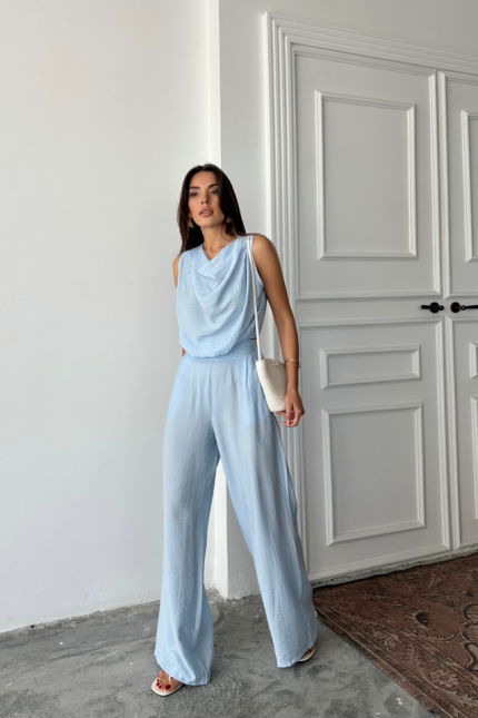 DEGAJE YAKA KOLSUZ BLUZ – PANTOLON TAKIM – Mavi