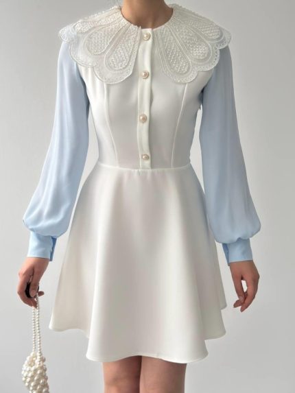 Pileli Kontrast Gömlek Elbise – Beyaz