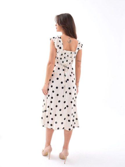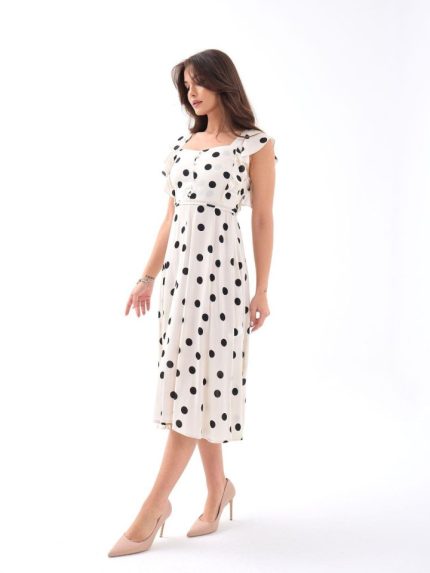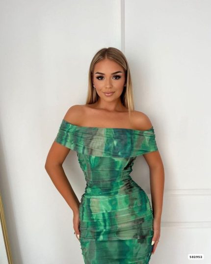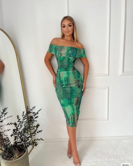 Kadın Omuzlardan Açık Yuvarlak Yaka Pileli Viskon Elbise