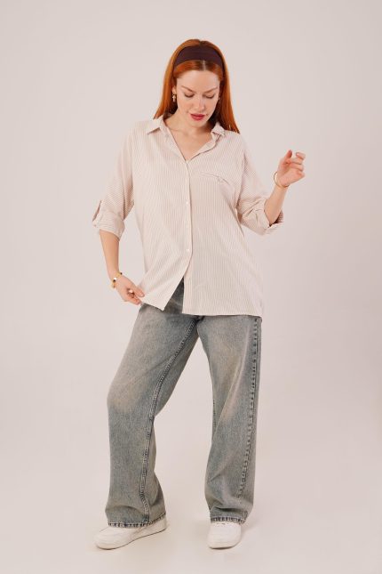 Kadın Flamlı Keten Tek Cep Oversızed Gömlek