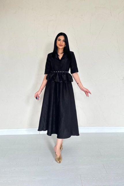 Kadın Uzun Kollu Bisiklet Yaka önden Volanlı Ithal Krep Elbise