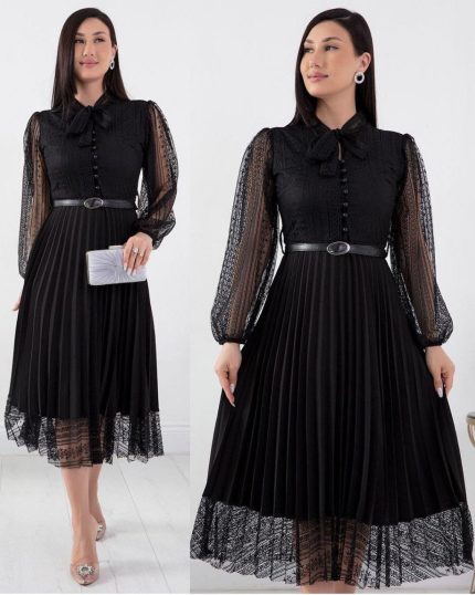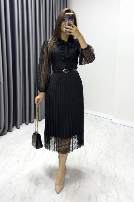 Kadın Denim Kumaş Dantel Detay Pileseli Elbise