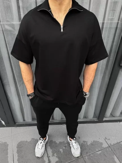 Unisex Yarım Fermuarlı Basic T-Shirt – Siyah