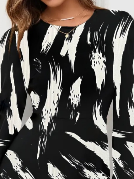 Kadın Uzun Kollu Bisiklet Yaka Desenli Kısa Krep Elbise