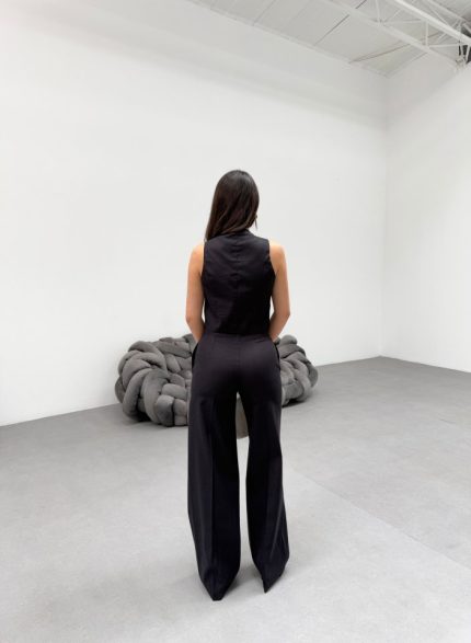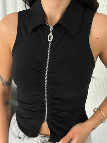 Yakalı Tam Fermuarlı Kolsuz Bluz – Siyah