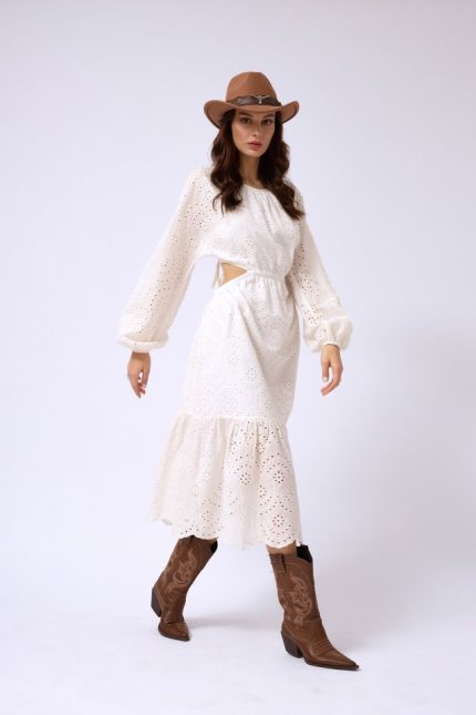 Kadın Uzun Kol Tül Drapeli Midi Boy Elbise