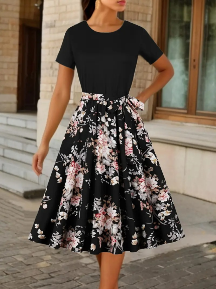 Kadın Kısa Kollu Bisiklet Yaka çiçek Desenli üst Viskon Alt Süprem Kısa Elbise