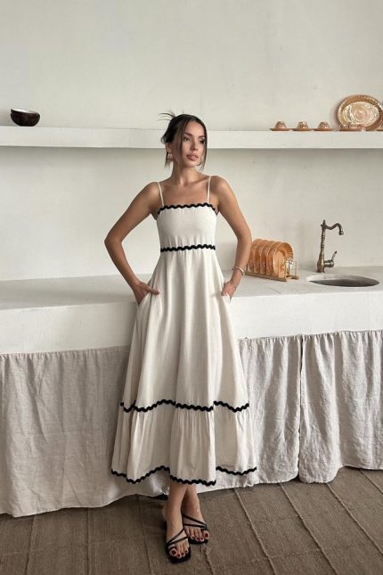 Fuşya Boyundan Bağlamalı Keten Elbise