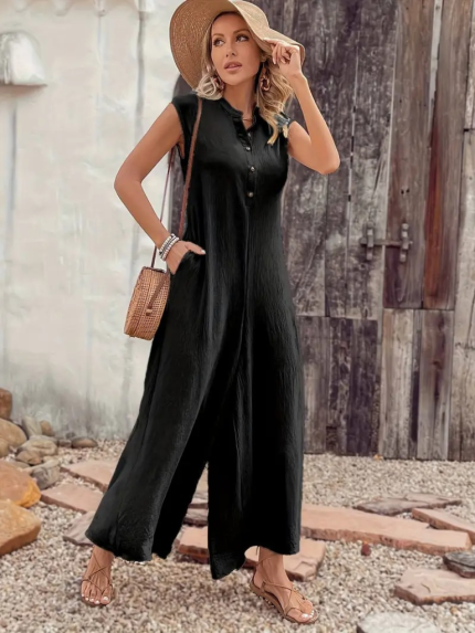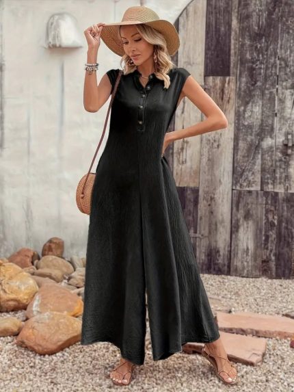 Kadın Kısa Kollu önden Düğmeli Paçaya Doğru Geniş Cepli Uzun Bürümcük Tulum