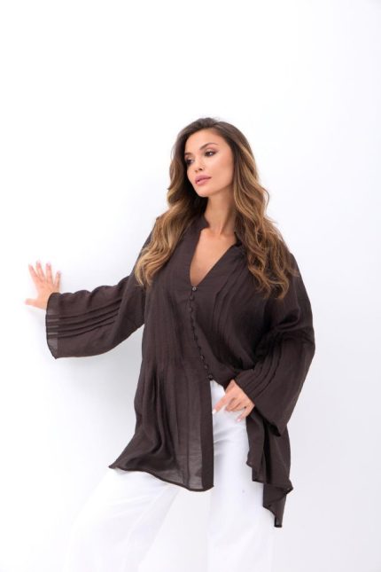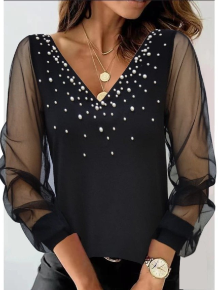 Kadın Uzun Kollu V Yaka Kolları Tül Yaka Kenarı Ve Göğüs Inci Detay Krep Bluz