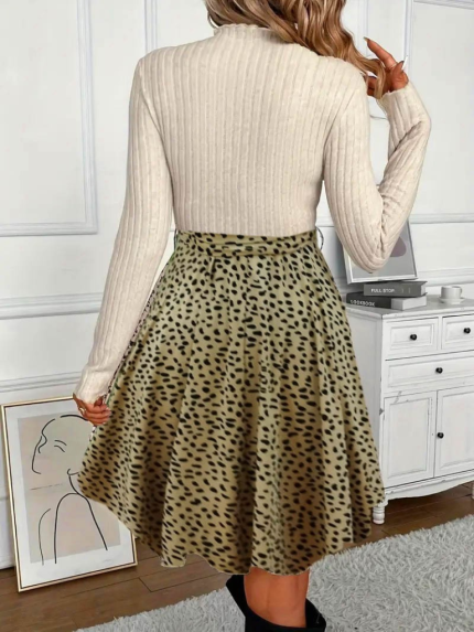 Kadın Uzun Kollu Kruvaze Yakalı Belden Kuşaklı Leopar