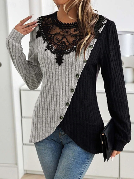 Kadın Uzun Kollu Bisiklet Yaka Desenli Viskon Iki Iplik Bluz