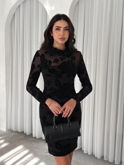 Kadın Uzun Kollu Bisiklet Yaka Desenli Viskon Iki Iplik Elbise