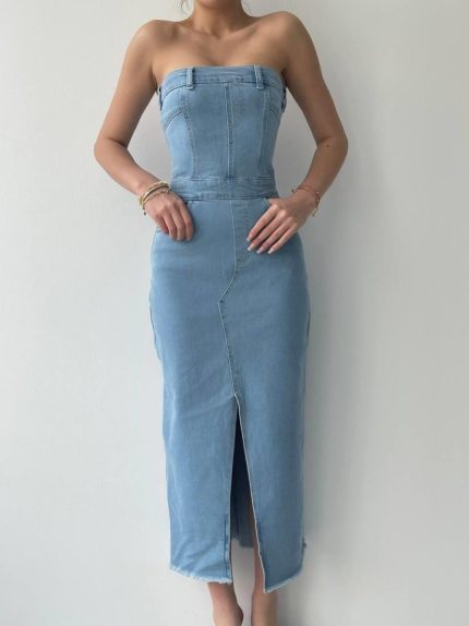 Kadın Balıkçı Yaka Toka Detay Sandy Kumaş Midi Boy Elbise