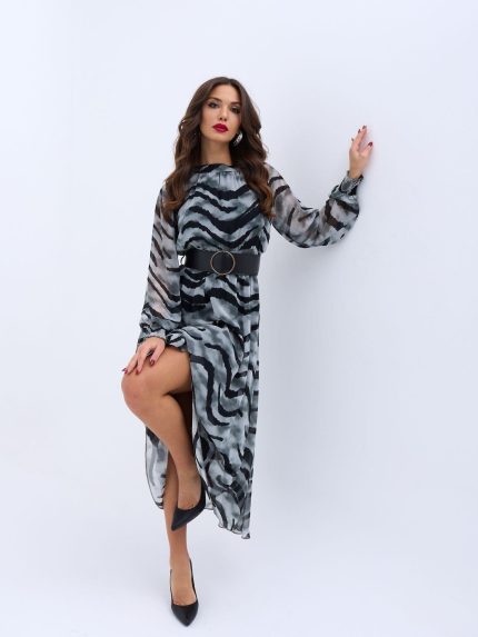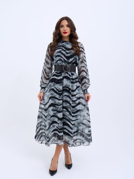 Kadın Reglan Kol Daire Yaka üst Viskon Alt Süprem Desenli Midi Elbise