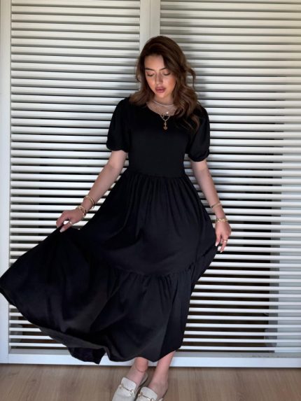 Kolsuz Yarım Bogazlı Uzun Elbise- Siyah