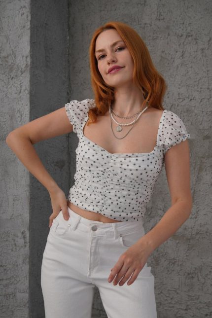 Puantiyeli Belden Oturtmalı Tül Beyaz Bluz