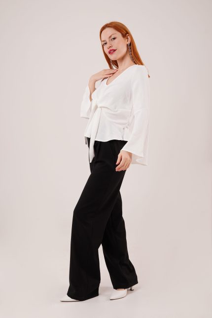 Ön Bağlamalı Volan Kol Beyaz Bluz