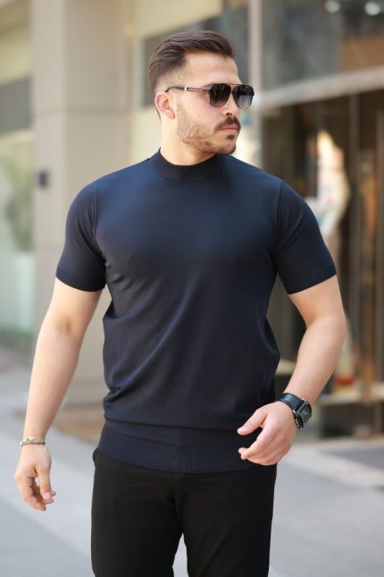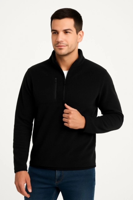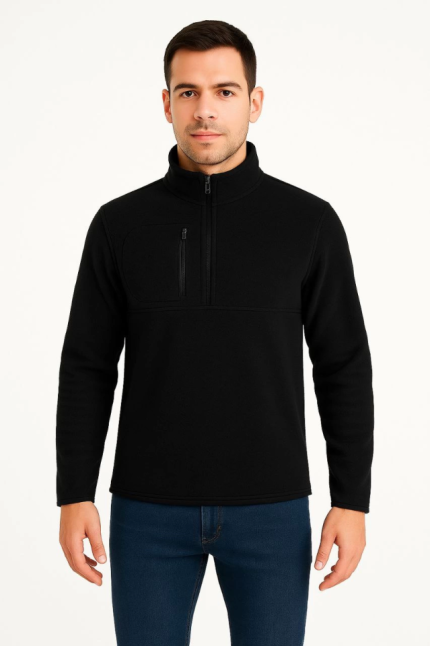 Erkek Polar Kazak – Dik Yaka, Yarım Fermuarlı, Fermuarlı Göğüs Cepli, Siyah Biyeli, Kışlık Rahat Regular Fit Günlük Model – Siyah